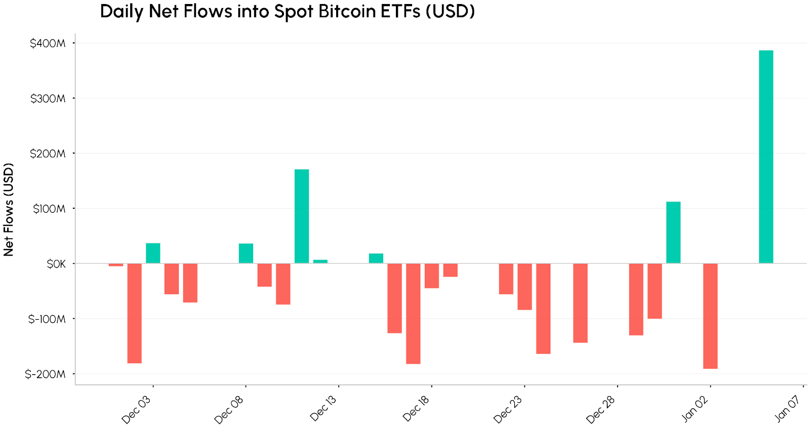 Institutional demand made a comeback as spot Bitcoin ETFs snapped a streak of year-end outflows, pulling in over $400M in net inflows on January 5th. The reversal follows over $320M in net outflows in the days surrounding New Year’s, signaling renewed appetite from institutional allocators as Q1 gets underway.