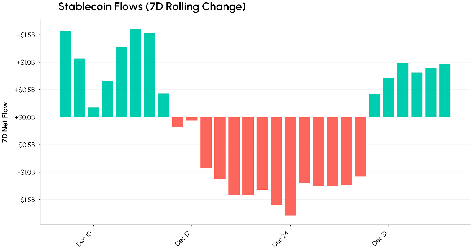 Stablecoin flows offer a proxy for capital entering or exiting the crypto ecosystem. After steady inflows through early December, flows turned negative into year-end, with weekly net outflows exceeding $1B. Heading into January, flows have begun to stabilize and turn positive, a constructive sign for sustained momentum if the trend holds.