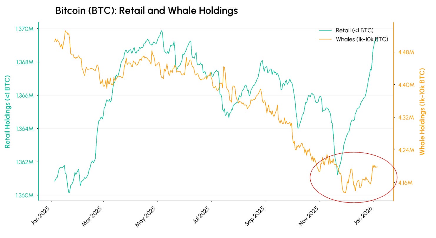 Onchain, distribution from whale wallets (1k-10k BTC) appears to be abating as we enter January, suggesting reduced sell pressure from this cohort. Meanwhile, retail accumulation (<1 BTC) has accelerated since mid November, with smaller investors growing holdings as prices pulled back and consolidated from highs. Together, these trends point to a constructive setup, diminishing large-holder selling alongside persistent demand from smaller participants.