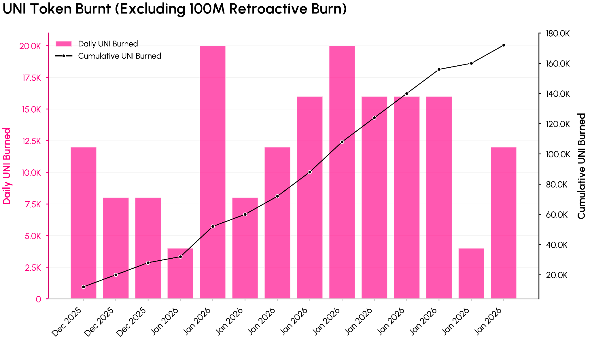 - Executes a retroactive treasury burn: Conducts a one off retroactive burn of 100 million UNI from the treasury, backfilling years of missed fee capture for tokenholders.