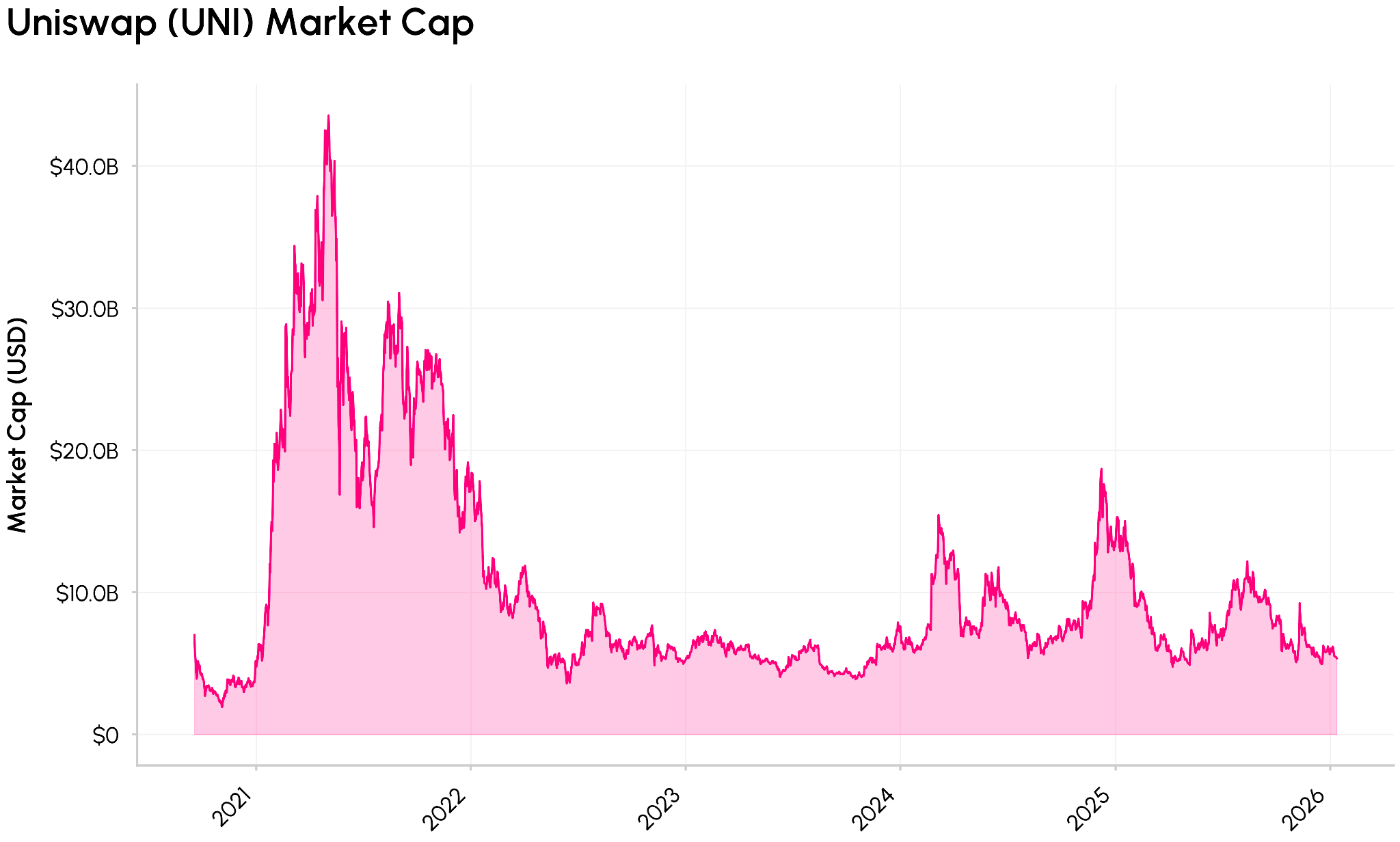 This highlights a new tradeoff. UNI has become more investable as a result of more explicit value capture, but the current numbers imply a high rate for future growth. For that revenue multiple to compress, Uniswap likely needs a combination of higher fee capture (broader pool coverage, v4 hooks, fee discount auctions, Unichain), sustained volume growth, and deflation that offsets the 20M UNI per‑year growth budget and other emissions.