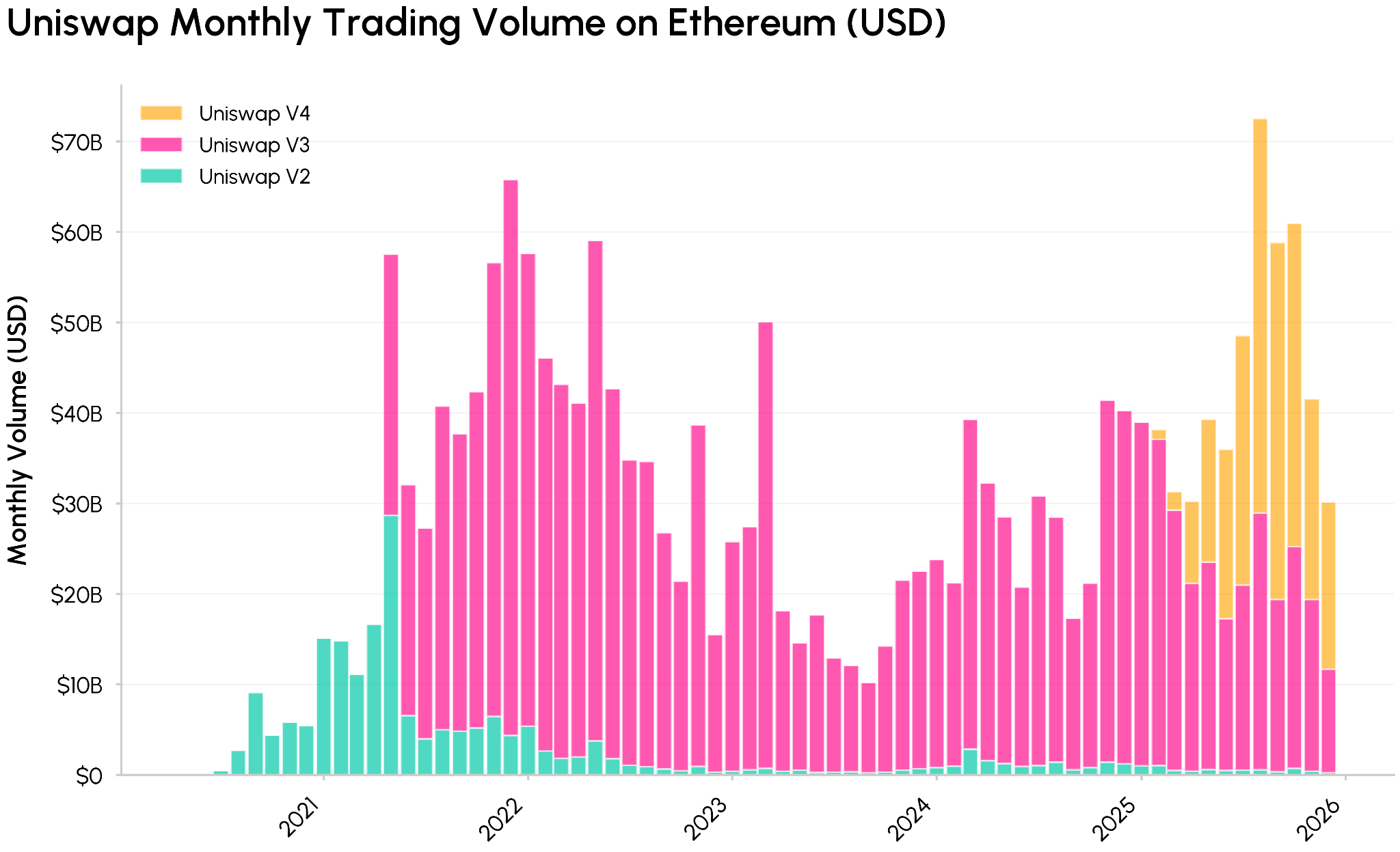 With new iterations, Uniswap became a core piece of on‑chain financial infrastructure, processing billions in volume and generating fees for its liquidity providers (LPs). Yet UNI, like most DeFi governance tokens, did not receive any direct share of protocol revenues, creating a growing disconnect between the scale of underlying cash flows and tokenholder economics.