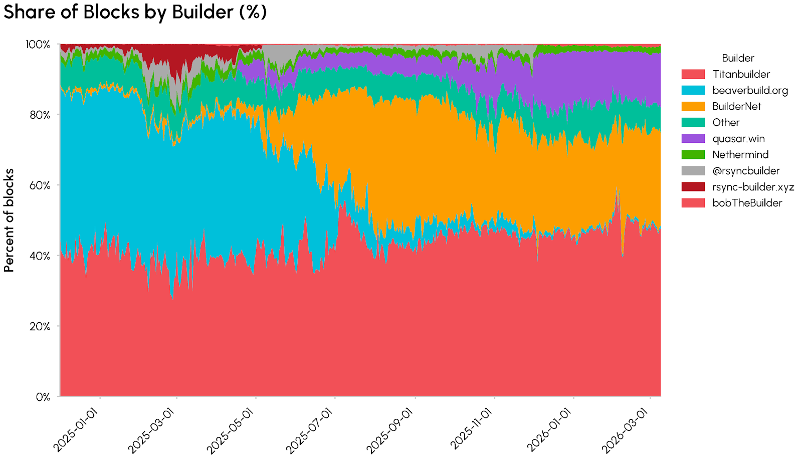Beaverbuild and Titanbuilder were previously the two largest Ethereum block builders. They had the most valuable order flow, thus they were able to bid more ETH to validators to win block auctions. The drawdown in Beaverbuild MEV-Boost value highlights Beaverbuild partnering with BuilderNet to share transaction flow across block builders.