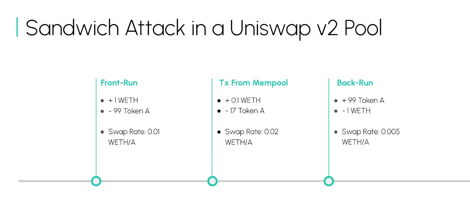 The user sends their request to Swap WETH to Token A to the mempool for 10 seconds, waiting to be added to a block. A searcher sees the opportunity routing to the Uniswap V2 Pool and can influence the liquidity available to change the swap rate the user receives. They create a front-run transaction that does the same thing as the user, swapping WETH for A, only it is a greater magnitude than the original swap.