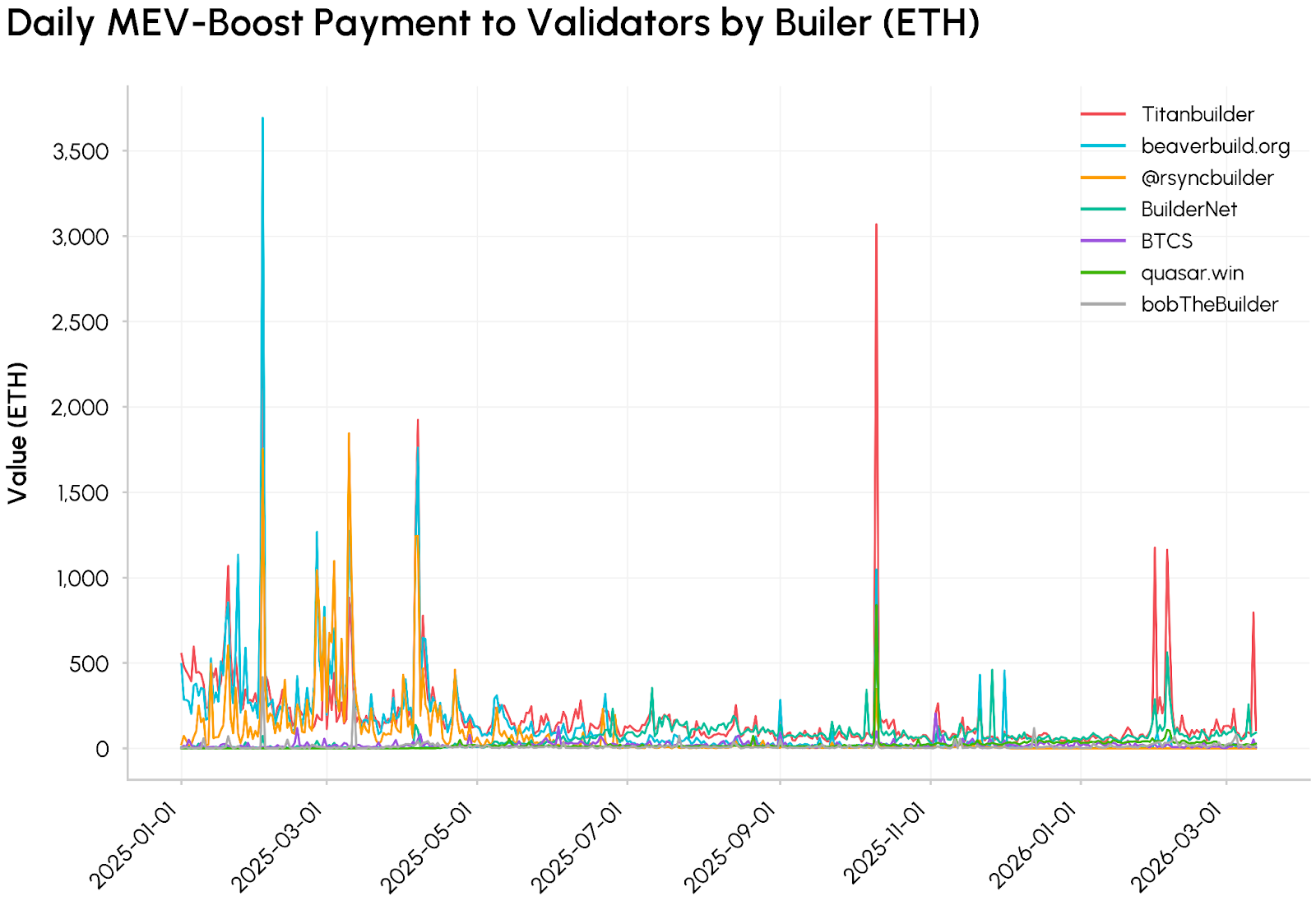 The overall drawdown in daily value captured by validators is a result of network improvements. Only BuilderNet and Titanbuilder have had a day over 500 ETH in MEV-Boost Value in 2026. Research continues to promote sending transactions privately or skipping the mempool to prevent malicious MEV opportunities. Adoption of Layer-2s and competing networks fighting for market share also affects the number of transactions on Ethereum.
