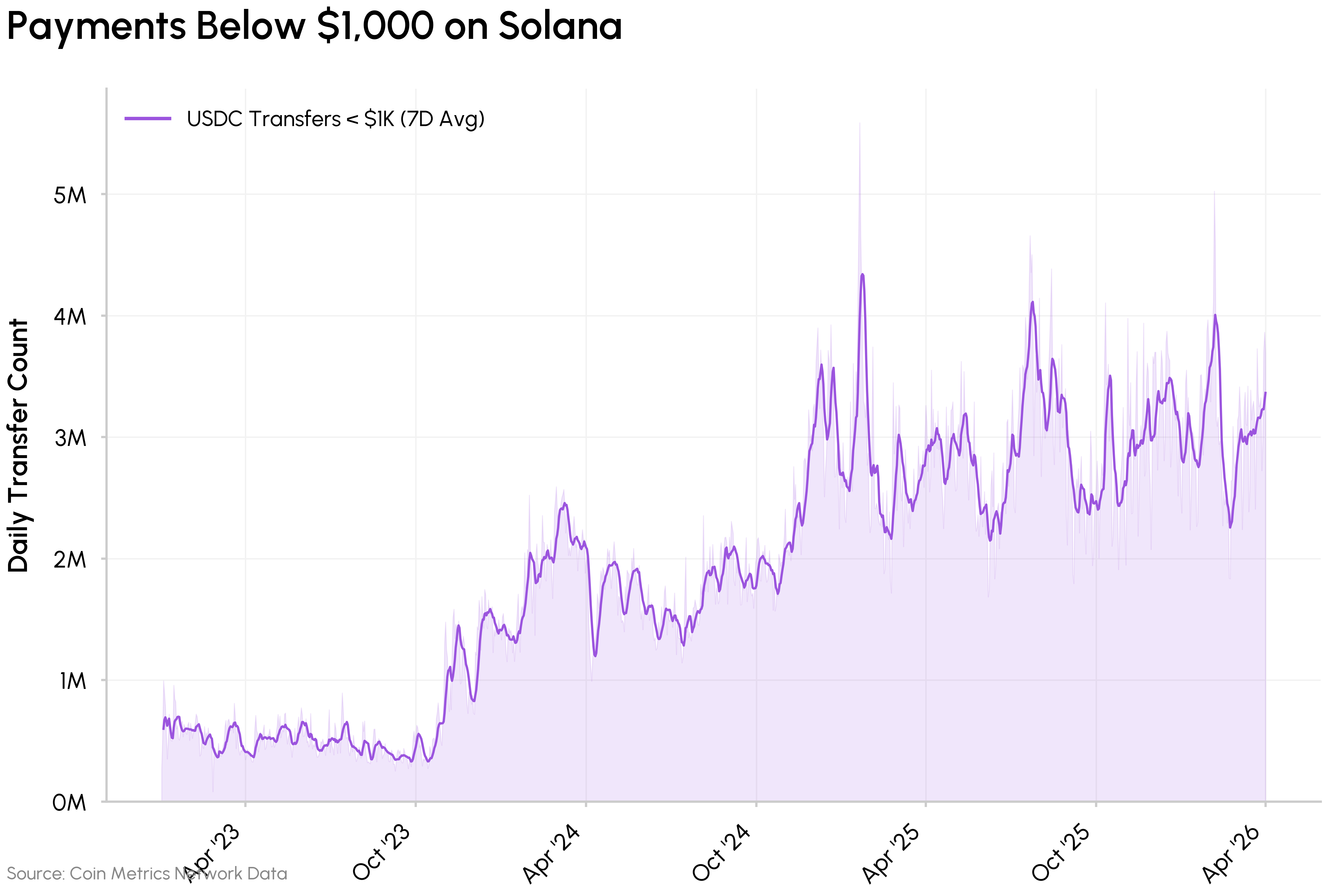 Solana’s low-cost environment has made it a leading chain for payments and consumer-scale value transfer. Sub-$1,000 USDC transfers consistently see ~3M in daily transactions, with median transaction sizes consistently below $100.