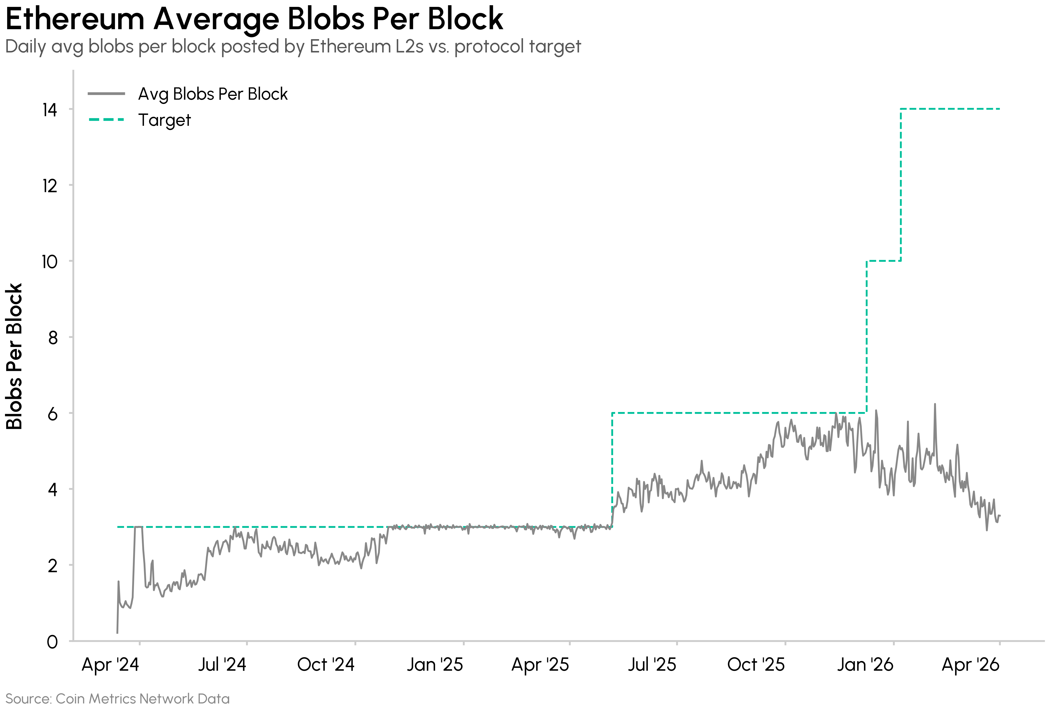 Blob space (the dedicated data availability layer L2s use to post transaction data to Ethereum) is <30% full, with ~3 blobs per block on average following recent capacity expansions. Blob utilization is concentrated among a few L2s and blob fees remain a negligible portion of overall transaction fee revenue. The L1 has scaled ahead of L2 settlement demand, and the cost of settling on Ethereum is no longer a meaningful moat for most L2s.