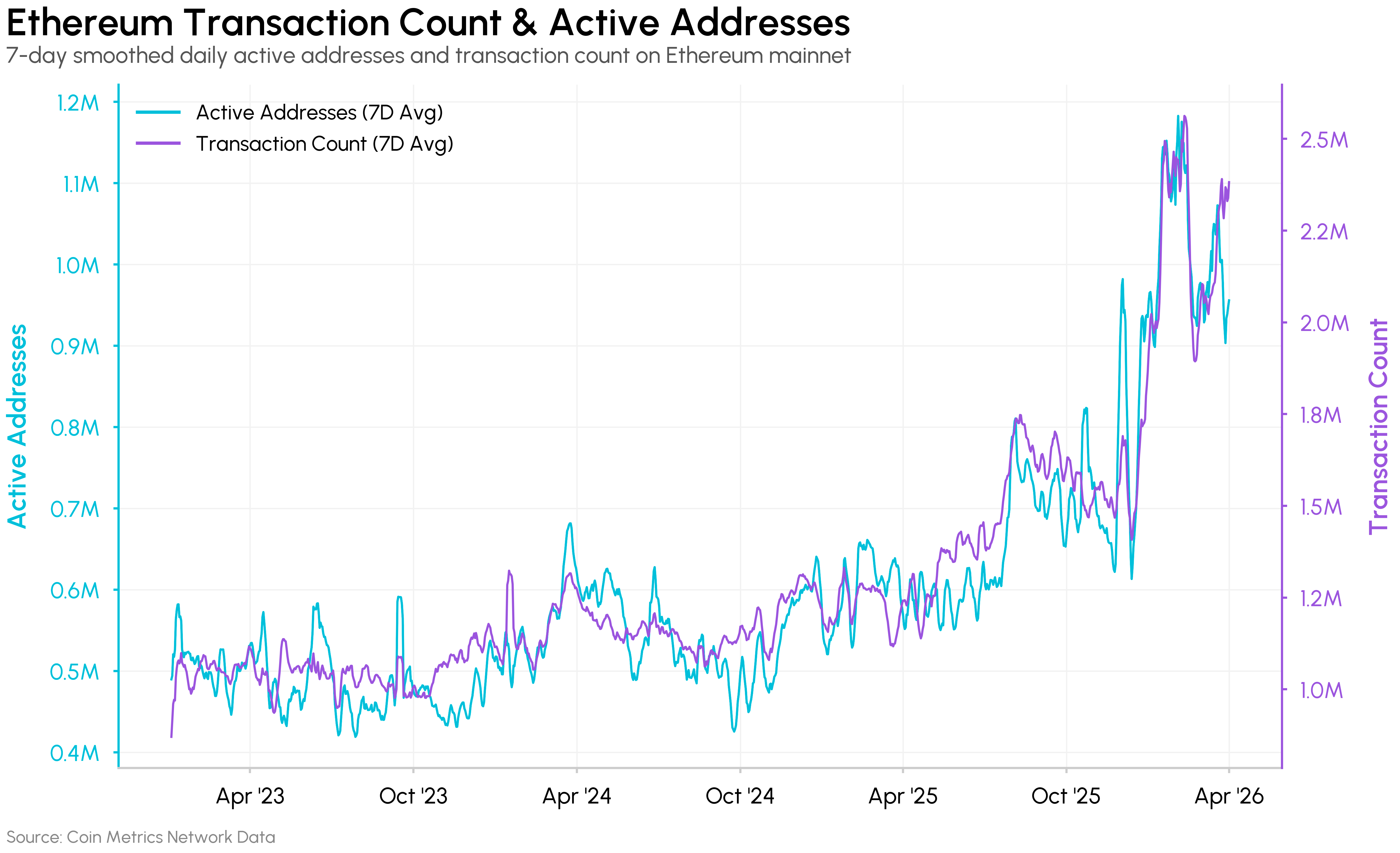 Daily active addresses and transactions on Ethereum mainnet have roughly doubled year over year, crossing 1M and 2.4M respectively. However, as we previously found, a portion of this increase reflects address poisoning attacks and a rise in dust addresses (wallets holding under $1), which at times have made up a significant share of daily active addresses.