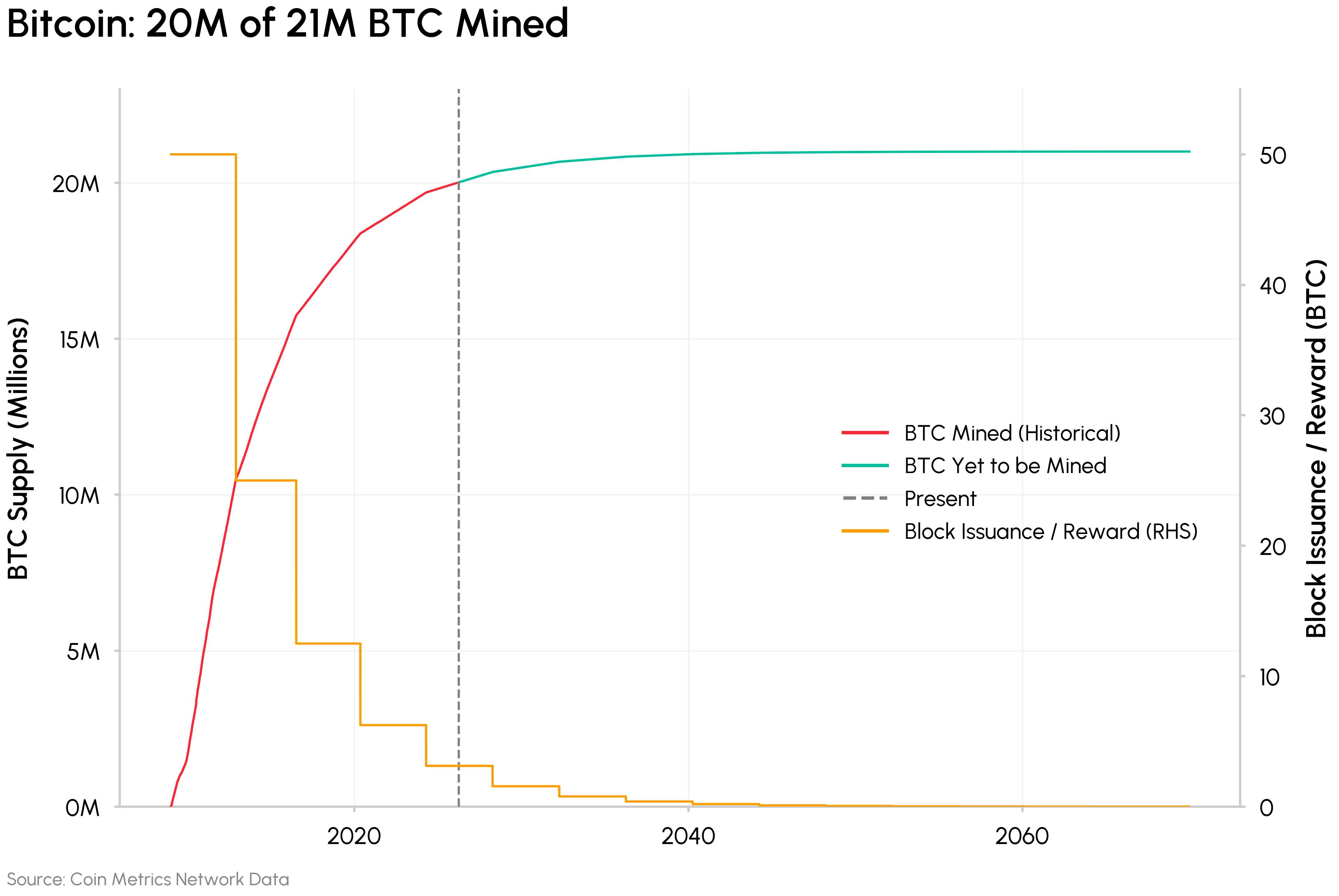 In March 2026, the 20 millionth Bitcoin was mined, leaving only 1 million BTC left to be issued going ahead. Over 95% of Bitcoin’s total supply is already in circulation, and with the block subsidy now at 3.125 BTC following the April 2024 halving, issuance continues its programmatic decline.
