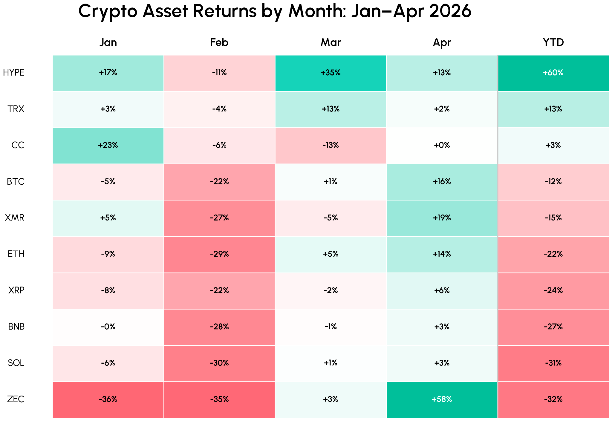 In April, the total crypto market capitalization climbed by around 10% to ~$2.7T, extending the market’s recovery against a backdrop of extended geopolitical conflict and disruption to oil and energy markets. Bitcoin (BTC) and Ethereum (ETH) rose 16% and 14% respectively, while major equities indices also rebounded from their March lows. Bitcoin dominance remains around 57% as BTC pushes towards the upper end of its recent price range, with notable altcoin outperformers over the month including Zcash (+59%) and Morpho (+33%).