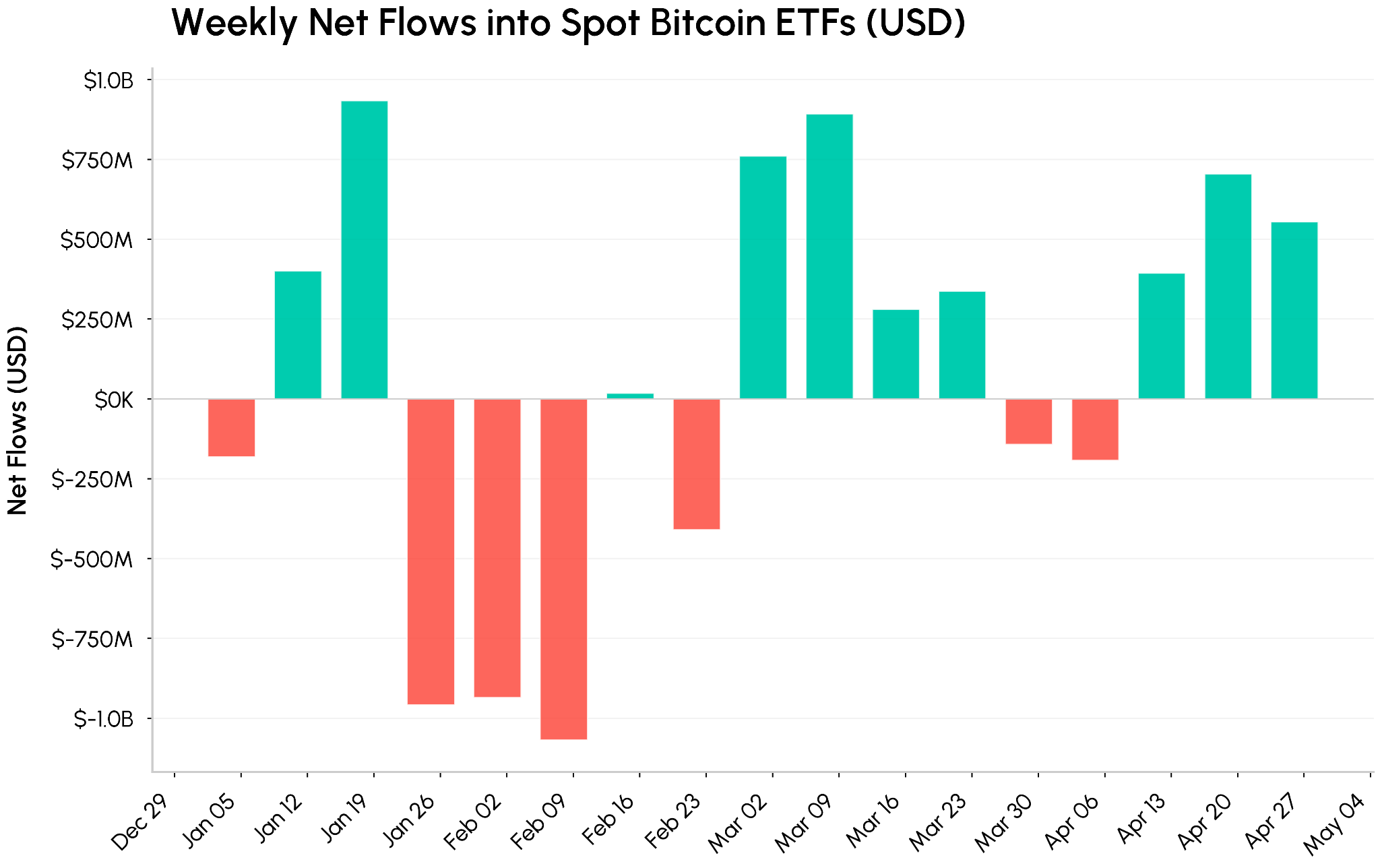 Institutional demand continued to build underneath through improving ETF flows, adding to March’s momentum since the US-Iran ceasefire came into effect. Net inflows into spot Bitcoin ETFs in April crossed roughly $1.7B, making it the strongest month since October 2025.