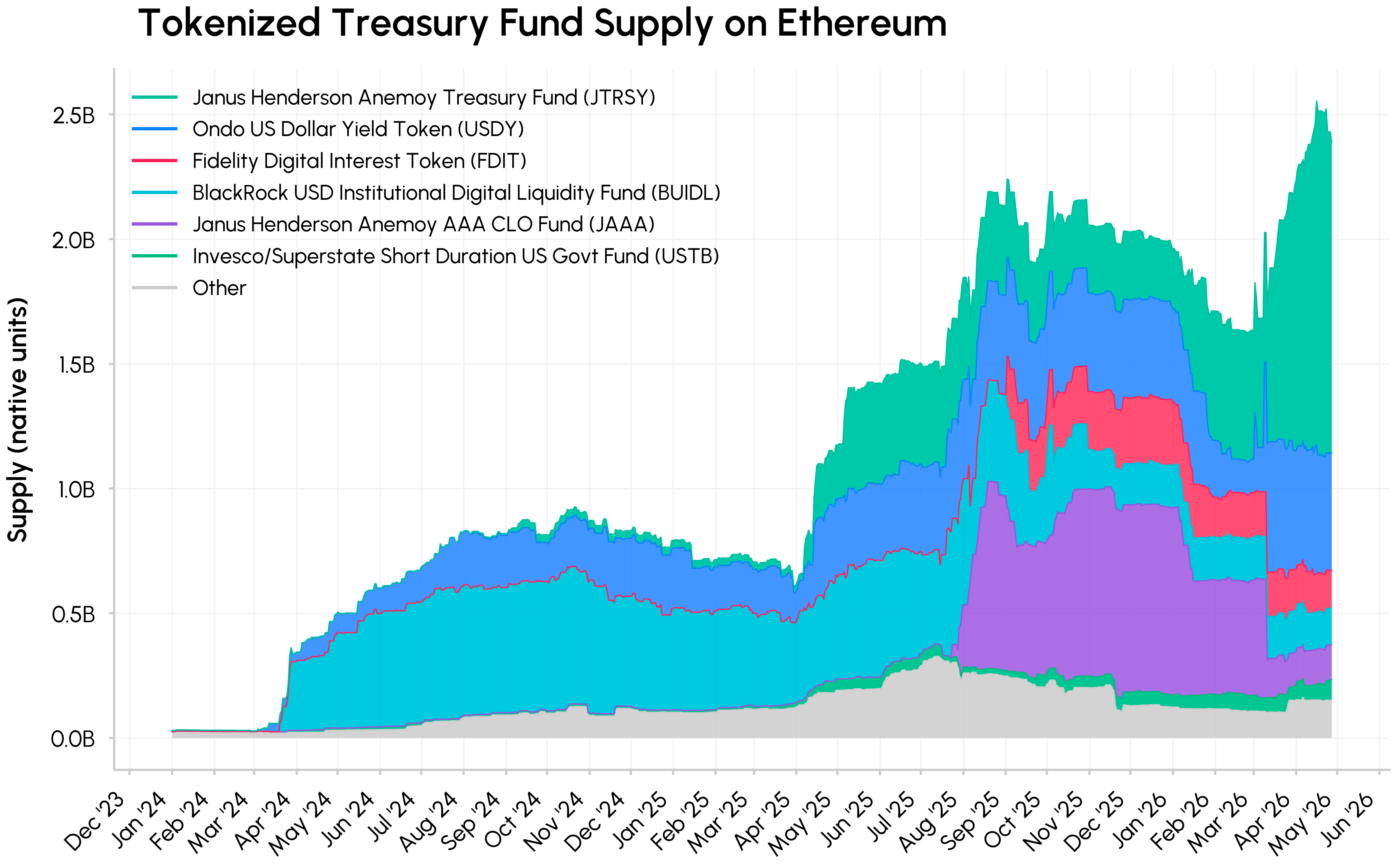 The circulating supply of major tokenized treasury funds such as Ondo’s US Dollar Yield (USDY) and Short-term US Government Bond Fund (OUSG), Janus Henderson’s Anemoy Treasury Fund (JTRSY), and BlackRock’s BUIDL have grown from effectively zero in early 2024 to its highest levels yet by April 2026 on Ethereum, while also expanding their footprint cross-chain.