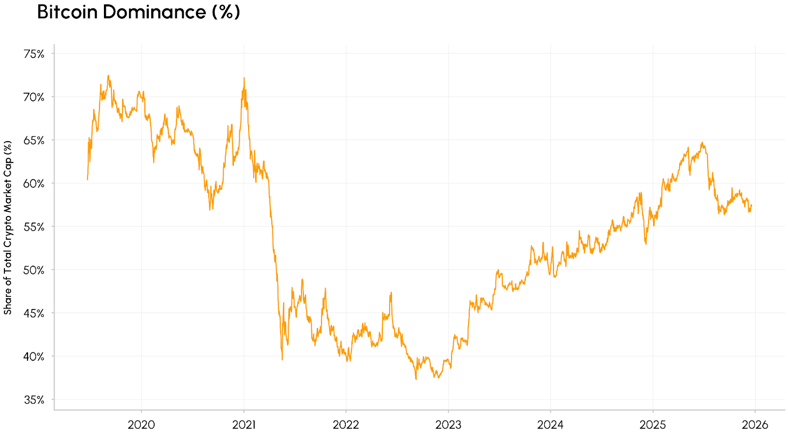 This sustained rise in Bitcoin dominance has been compounded by increased institutionalization through spot ETF access, attracting over $150B in long term capital rather than short term retail flows. This has reinforced Bitcoin’s role as a “safe haven” in crypto markets and a liquid, regulated entry point for traditional allocators, making its dominance a more persistent phenomenon than in past cycles where “altcoin seasons” quickly eroded BTC’s share.