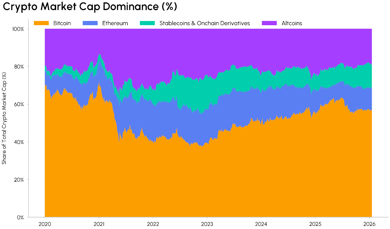 - As the crypto investment universe expands, capital is becoming more selective across a smaller set of assets: Bitcoin dominance is in a sustained uptrend, while growth in stablecoins and onchain derivatives compresses the space for the altcoin segment.