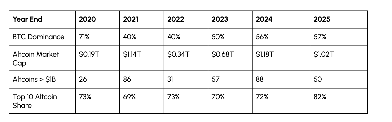 The table below summarizes how these dynamics have evolved year over year. While some metrics appear cyclical, with BTC dominance falling in bull markets and rising in bears, the market share of top 10 altcoins tell a different story. This metric remained stable at 69-73% across all market conditions from 2020-2024, then jumped to 82% in 2025, suggesting a structural or defensive shift toward established assets rather than just a temporary flight to quality.